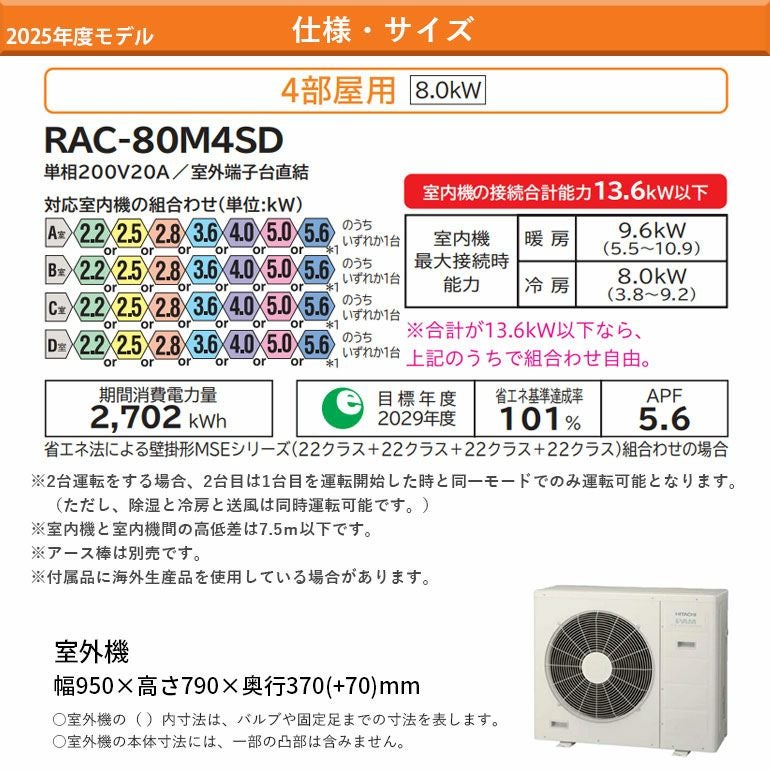 他の画像を見る RAC-80M4SD 日立 システムマルチ室外機 4部屋用8.0KW 室外機のみ。2台以上の室内機と室外機を組み合わせるマルチタイプ。4部屋用。 室外機のみ 日立 白くまくん 代引不可 単相200V 2025年モデル 4部屋用 ¥ 222,700 税込 詳細を見る お気に入りに登録する