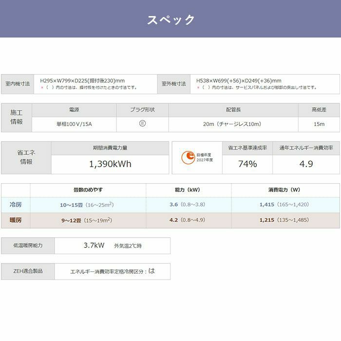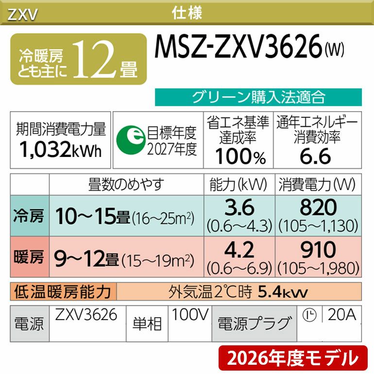 他の画像を見る 標準工事費込。高精度赤外線センサームーブアイmirA.I.+やバイタルセンサーエモコアイ搭載。主に12畳用。 【標準工事費込み】MSZ-ZXV3626-W 三菱電機 Zシリーズ エアコン 主に12畳用 三菱 霧ヶ峰 標準工事費込み 代引不可 単相100V 日本製 2026年モデル ¥ 222,750 税込 詳細を見る お気に入りに登録する