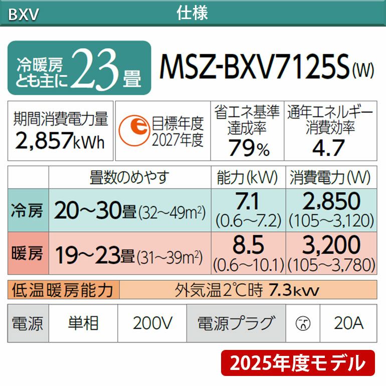 他の画像を見る 標準工事費込。室内機の高さ255mmでコンパクト。内部クリーンでカビ抑制。主に23畳用。 【標準工事費込み】MSZ-BXV7125S-W 三菱電機 BXVシリーズ エアコン 主に23畳用 三菱 霧ヶ峰 標準工事費込み 代引不可 単相200V 日本製 2025年モデル ¥ 200,990 税込 詳細を見る お気に入りに登録する