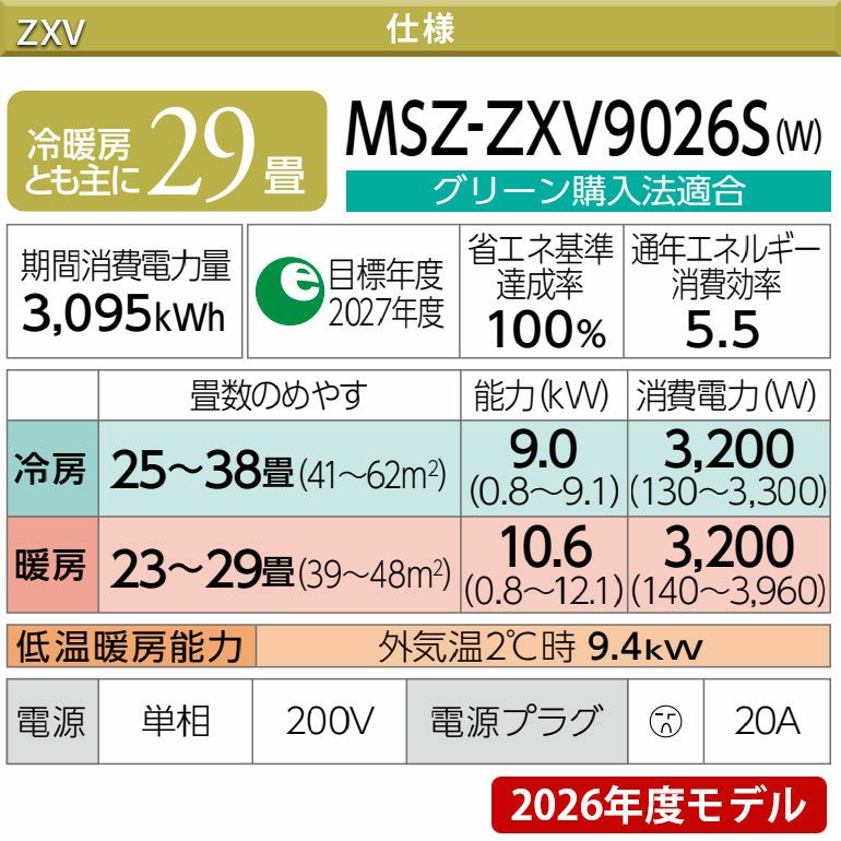他の画像を見る 標準工事費込。高精度赤外線センサームーブアイmirA.I.+やバイタルセンサーエモコアイ搭載。主に29畳用。 【標準工事費込み】MSZ-ZXV9026S-W 三菱電機 Zシリーズ エアコン 主に29畳用 三菱 霧ヶ峰 標準工事費込み 代引不可 単相200V 日本製 2026年モデル ¥ 339,600 税込 詳細を見る お気に入りに登録する