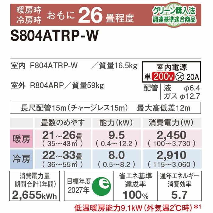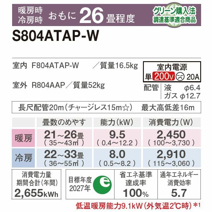 エリア限定●標準工事費用込みエアコン●「Premium プラズマ空清」「凍結脱臭クリーナー」「凍結洗浄 除菌ヒートプラス」「ファンお掃除ロボ」「カビバスター」「ステンレス・クリーン システム」搭載プレミアムモデル。主に26畳用。