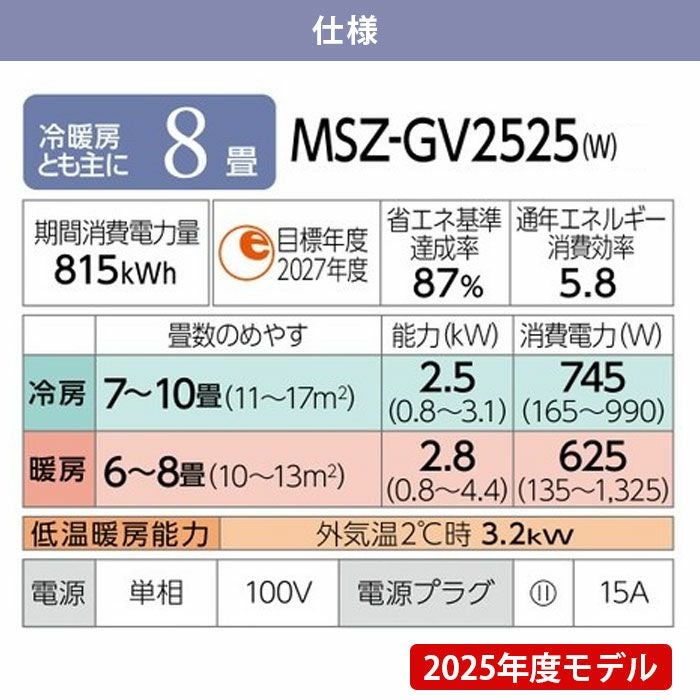 他の画像を見る MSZ-GV2525-W 三菱電機 ルームエアコン GVシリーズ 主に8畳用 2025年モデル おまかせボディでエアコン内部をカビから守ります。基本機能と品質にこだわったGVシリーズスタンダードモデル 三菱 霧ヶ峰 代引不可 単相100V 日本製 2025年モデル ¥ 58,200 税込 詳細を見る お気に入りに登録する