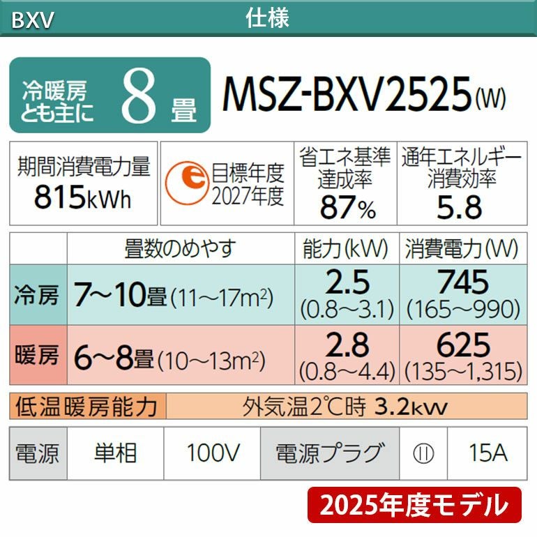 他の画像を見る MSZ-BXV2525-W 三菱電機 BXVシリーズ エアコン 主に8畳用 室内機の高さ255mmでコンパクト。内部クリーンでカビ抑制。主に8畳用。 三菱 霧ヶ峰 代引不可 単相100V 日本製 2025年モデル ¥ 101,800 税込 詳細を見る お気に入りに登録する