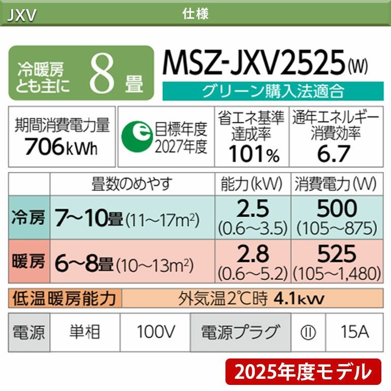 他の画像を見る MSZ-JXV2525-W 三菱電機 JXVシリーズ エアコン 主に8畳用 保湿効果もあるピュアミストで菌・ウイルス・カビ菌・花粉を抑制し、お部屋の空気を清潔に。主に8畳用。 三菱 霧ヶ峰 代引不可 単相100V 日本製 2025年モデル ¥ 122,700 税込 在庫切れ 詳細を見る お気に入りに登録する