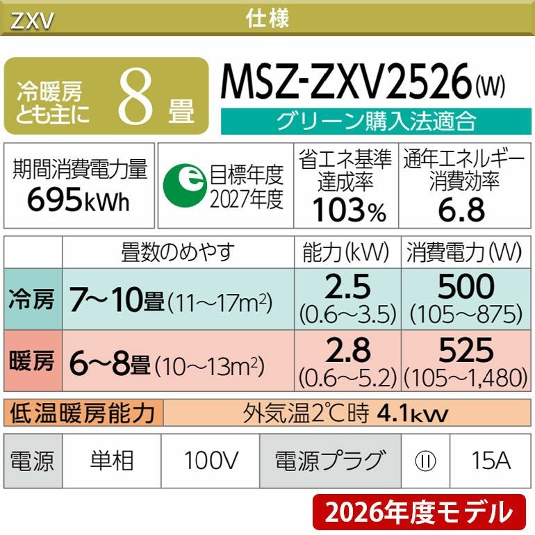 他の画像を見る MSZ-ZXV2526-W 三菱電機 Zシリーズ エアコン 主に8畳用 高精度赤外線センサームーブアイmirA.I.+やバイタルセンサーエモコアイ搭載。主に8畳用。 三菱 霧ヶ峰 代引不可 単相100V 日本製 2026年モデル ¥ 177,030 税込 詳細を見る お気に入りに登録する