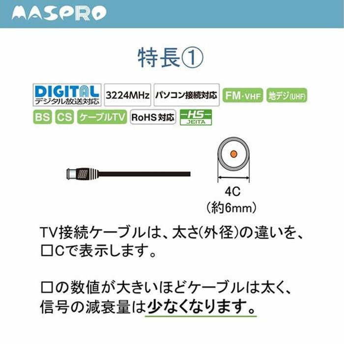 他の画像を見る JLS2W-PN マスプロ 家庭用TV接続ケーブル 2m 4K・8K衛星放送(3224MHz)対応 片端L型・片端ストレートプラグ付テレビ接続ケーブル●太さ4Cケーブル●ケーブ長さ2m ¥ 1,200 税込 カートに入れる お気に入りに登録する