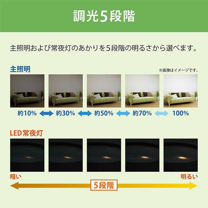 | 制御機能 | リモコン:多段調光(100%⇔約70%⇔約50%⇔約30%⇔約10%)、LED常夜灯、滅/壁スイッチコントロール |