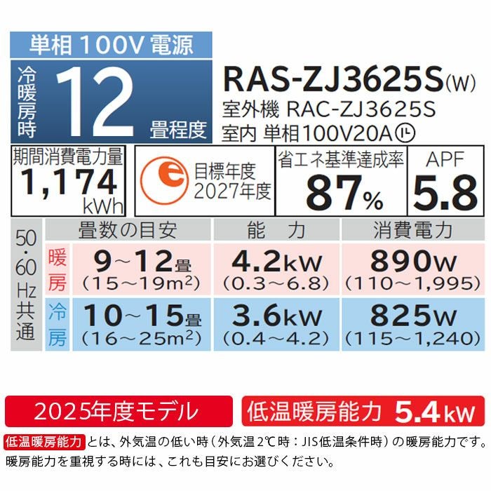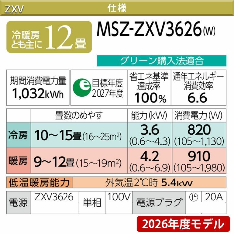 他の画像を見る 標準工事費込。高精度赤外線センサームーブアイmirA.I.+やバイタルセンサーエモコアイ搭載。主に12畳用。 【標準工事費込み】MSZ-ZXV3626-W 三菱電機 Zシリーズ エアコン 主に12畳用 三菱 霧ヶ峰 標準工事費込み 代引不可 単相100V 日本製 2026年モデル ¥ 217,800 税込 詳細を見る お気に入りに登録する