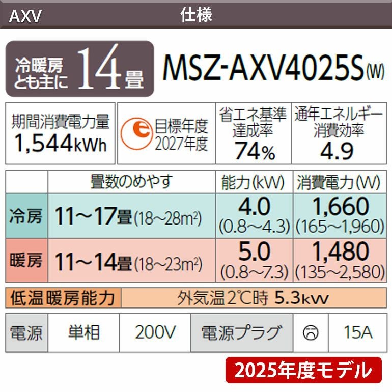 他の画像を見る 標準工事費込。「消し忘れオートOFF」で、うっかり消し忘れても自動で電源を落として節約にも貢献。主に14畳用。 【標準工事費込み】MSZ-AXV4025S-W 三菱電機 AXVシリーズ エアコン 主に14畳用 三菱 霧ヶ峰 標準工事費込み 代引不可 単相200V 日本製 2025年モデル ¥ 129,210 税込 詳細を見る お気に入りに登録する