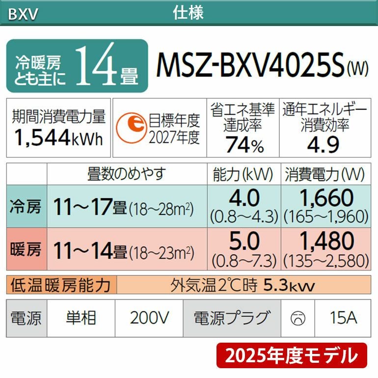 他の画像を見る 室内機の高さ255mmでコンパクト。内部クリーンでカビ抑制。主に14畳用。 MSZ-BXV4025S-W 三菱電機 BXVシリーズ エアコン 主に14畳用 三菱 霧ヶ峰 代引不可 単相200V 日本製 2025年モデル ¥ 134,300 税込 詳細を見る お気に入りに登録する