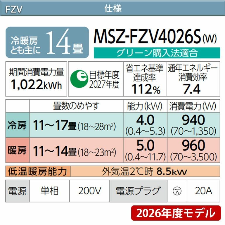 他の画像を見る 霧ヶ峰FZシリーズは8年連続省エネNo.1(2019~2026年度)。 主に14畳用。 MSZ-FZV4026S-W 三菱電機 FZシリーズ エアコン 主に14畳用 三菱 霧ヶ峰 代引不可 単相200V 日本製 2026年モデル ¥ 234,060 税込 詳細を見る お気に入りに登録する