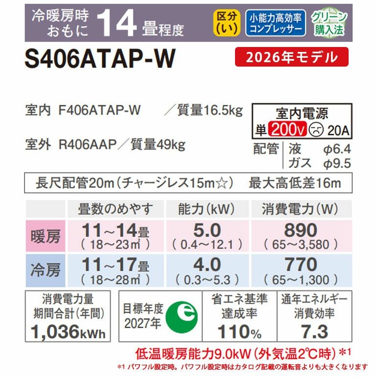 他の画像を見る エリア限定●標準工事費用込みエアコン●工事保証3年付●さらら除湿、快適気流など便利機能が充実のハイグレードモデル 【標準工事費込み】 S406ATAP-W ダイキン ルームエアコン AXシリーズ 主に14畳用 ダイキン AXシリーズ 標準工事費込み 代引不可 単相200V 2026年モデル ¥ 218,780 税込 詳細を見る お気に入りに登録する