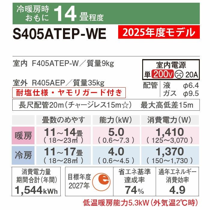 他の画像を見る 沖縄県限定配送●標準工事費込み●沖縄の環境に最適化された耐塩害仕様エアコンです。主に14畳用 【沖縄本島限定】【標準工事費込み】S405ATES-WE ダイキン ルームエアコン Eシリーズ 耐塩害仕様 主に14畳用 ダイキン Eシリーズ 標準工事費込み 代引不可 単相200V 2025年モデル ¥ 149,800 税込 詳細を見る お気に入りに登録する