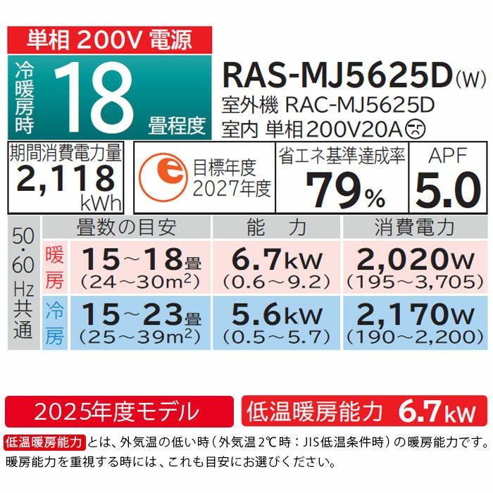 他の画像を見る 本体奥行き25㎝の薄型で寝室や子ども部屋などにもすっきり設置できる薄型モデル RAS-MJ5625D-W 日立 MJシリーズ 白くまくん ルームエアコン 2025年モデル 主に18畳用 日立 白くまくん 代引不可 単相200V フィルター自動洗浄 2025年モデル ¥ 119,600 税込 詳細を見る お気に入りに登録する
