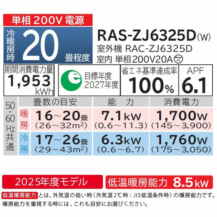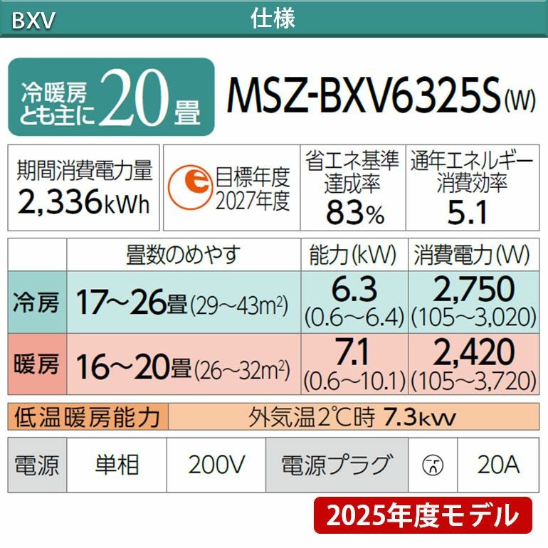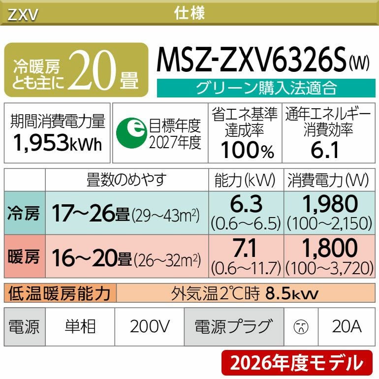 他の画像を見る 標準工事費込。高精度赤外線センサームーブアイmirA.I.+やバイタルセンサーエモコアイ搭載。主に20畳用。 【標準工事費込み】MSZ-ZXV6326S-W 三菱電機 Zシリーズ エアコン 主に20畳用 三菱 霧ヶ峰 標準工事費込み 代引不可 単相200V 日本製 2026年モデル ¥ 272,730 税込 詳細を見る お気に入りに登録する