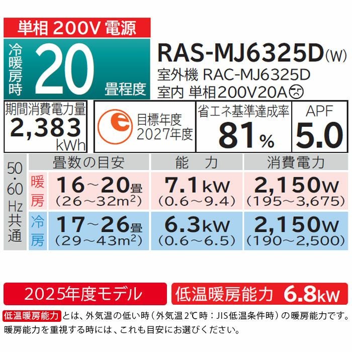 他の画像を見る 本体奥行き25㎝の薄型で寝室や子ども部屋などにもすっきり設置できる薄型モデル RAS-MJ6325D-W 日立 MJシリーズ 白くまくん ルームエアコン 2025年モデル 主に20畳用 日立 白くまくん 代引不可 単相200V フィルター自動洗浄 2025年モデル ¥ 132,200 税込 詳細を見る お気に入りに登録する