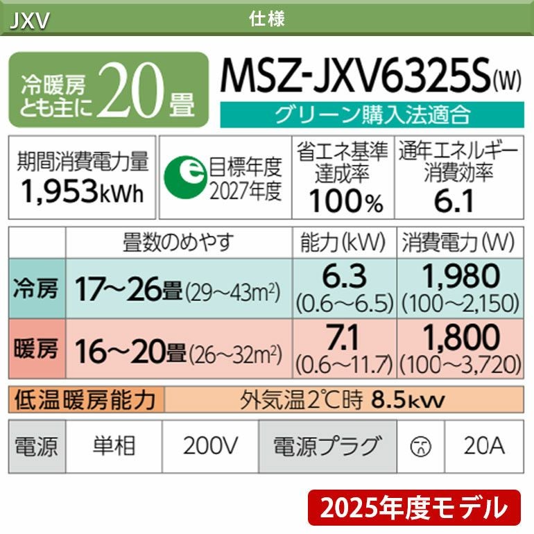 他の画像を見る 標準工事費込。保湿効果もあるピュアミストで菌・ウイルス・カビ菌・花粉を抑制し、お部屋の空気を清潔に。主に20畳用。 【標準工事費込み】MSZ-JXV6325S-W 三菱電機 JXVシリーズ エアコン 主に20畳用 三菱 霧ヶ峰 標準工事費込み 代引不可 単相200V 日本製 2025年モデル ¥ 226,700 税込 詳細を見る お気に入りに登録する