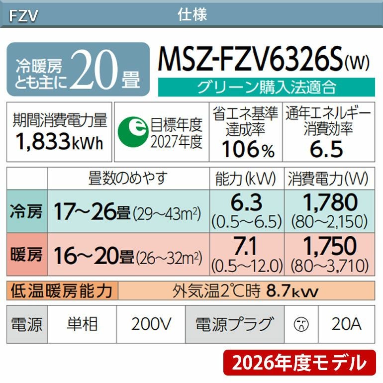 他の画像を見る 霧ヶ峰FZシリーズは8年連続省エネNo.1(2019~2026年度)。 主に20畳用。 MSZ-FZV6326S-W 三菱電機 FZシリーズ エアコン 主に20畳用 三菱 霧ヶ峰 代引不可 単相200V 日本製 2026年モデル ¥ 280,180 税込 詳細を見る お気に入りに登録する
