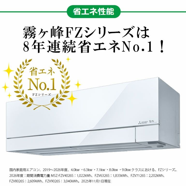 他の画像を見る 標準工事費込。霧ヶ峰FZシリーズは8年連続省エネNo.1(2019~2026年度)。 主に20畳用。 【標準工事費込み】MSZ-FZV6326S-W 三菱電機 FZシリーズ エアコン 主に20畳用 三菱 霧ヶ峰 標準工事費込み 代引不可 単相200V 日本製 2026年モデル ¥ 302,460 税込 詳細を見る お気に入りに登録する