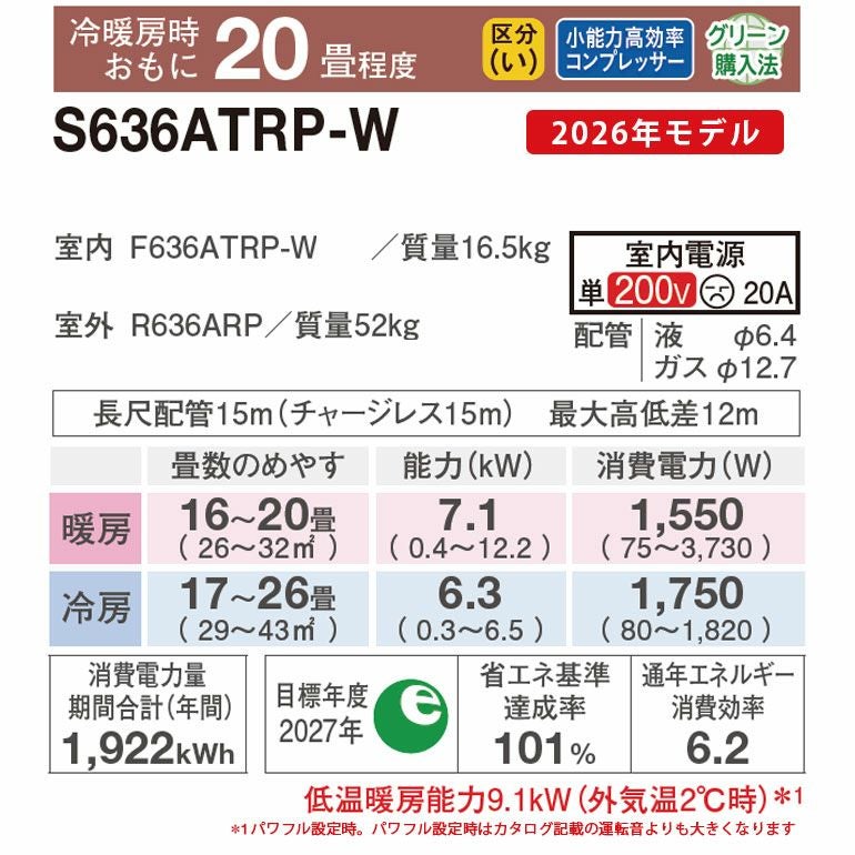 他の画像を見る エリア限定●標準工事費用込みエアコン●工事保証3年付●さらら除湿、快適気流など便利機能が充実のハイグレードモデル 【標準工事費込み】 S636ATAP-W ダイキン ルームエアコン AXシリーズ 主に20畳用 ダイキン AXシリーズ 標準工事費込み 代引不可 単相200V 2026年モデル ¥ 283,520 税込 詳細を見る お気に入りに登録する