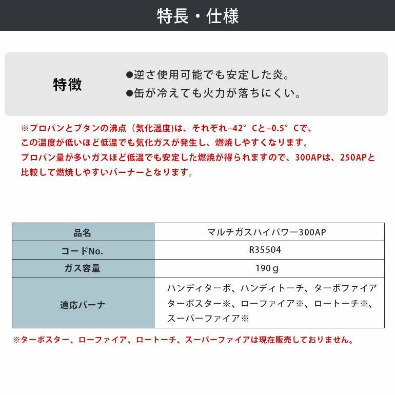 他の画像を見る ブタン50%プロパン50%の混合ガス。逆さ使用可能で自由自在。寒冷地でも安定した燃焼ができるのが特徴。 R35504 アサダ マルチガスハイパワー300AP 代引不可 ¥ 1,200 税込 在庫切れ 詳細を見る お気に入りに登録する