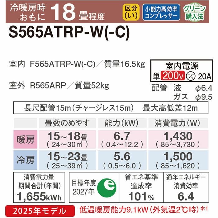他の画像を見る ダイキン工業 S565ATRS-W●エリア限定●標準工事費用込みエアコン●工事保証3年付●うるさら 【標準工事費込み】S565ATRP-W ダイキン ルームエアコン うるさら RXシリーズ 主に18畳用 標準工事費込み 代引不可 単相200V 2025年モデル ¥ 221,830 税込 在庫切れ 詳細を見る お気に入りに登録する