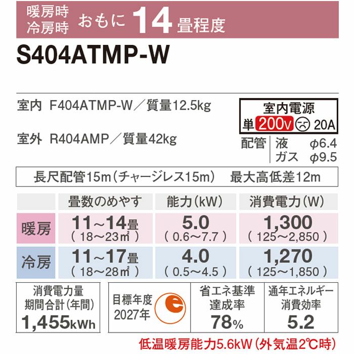 他の画像を見る ダイキン工業 S404ATMP-W●エリア限定●標準工事費用込みエアコン。工事保証3年付。 【標準工事費込み】S404ATMP-W ダイキン ルームエアコン うるさら MXシリーズ 主に14畳用 標準工事費込み 代引不可 単相200V 2024年モデル ¥ 179,590 税込 在庫切れ 詳細を見る お気に入りに登録する