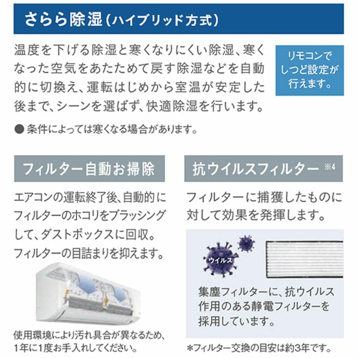 他の画像を見る 「凍結脱臭クリーナー」・「ファンお掃除ロボ」・「カビバスター」搭載プレミアムモデル。主に26畳用。 【標準工事費込み】RAS-XJ80R2-W 日立 ルームエアコン 白くまくん XJシリーズ 主に26畳用 日立 白くまくん 標準工事費込み 代引不可 単相200V フィルター自動洗浄 日本製 2024年モデル ¥ 245,840 税込 在庫切れ 詳細を見る お気に入りに登録する