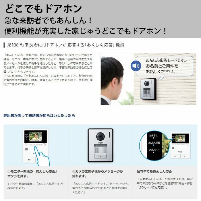 他の画像を見る 急な来訪者でも安心!便利機能が充実したどこでもドアホン VL-SWE310KFA パナソニック テレビドアホン 電源コード式・電源プラグ式 ¥ 33,630 税込 詳細を見る お気に入りに登録する