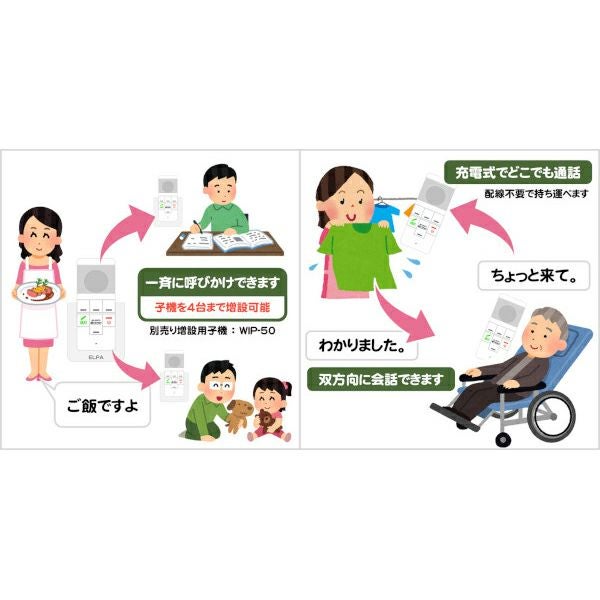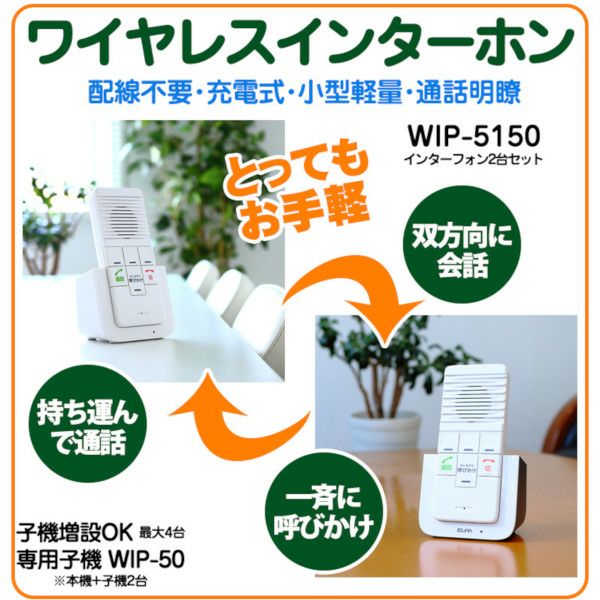 他の画像を見る 双方向通話や一斉に呼びかけができるワイヤレスインターホン。 WIP-5150SET エルパ ワイヤレスインターホン 乾電池式(ワイヤレス) ¥ 9,440 税込 カートに入れる お気に入りに登録する