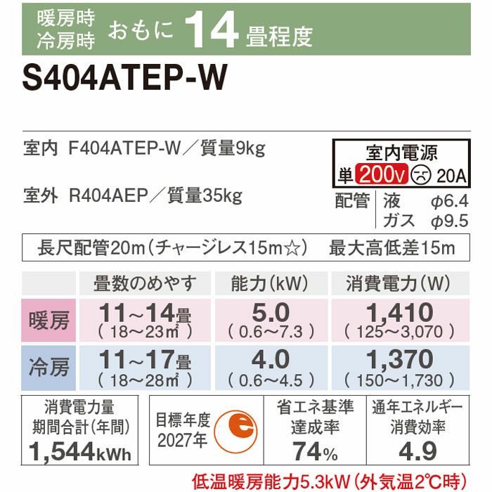 他の画像を見る ダイキン工業 S404ATEP-W●エリア限定●標準工事費用込みエアコン。工事保証3年付。 【標準工事費込み】S404ATEP-W ダイキン ルームエアコン Eシリーズ 主に14畳用 ダイキン Eシリーズ 標準工事費込み 代引不可 単相200V 2024年モデル ¥ 115,880 税込 詳細を見る お気に入りに登録する