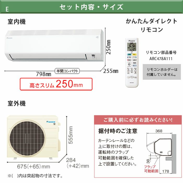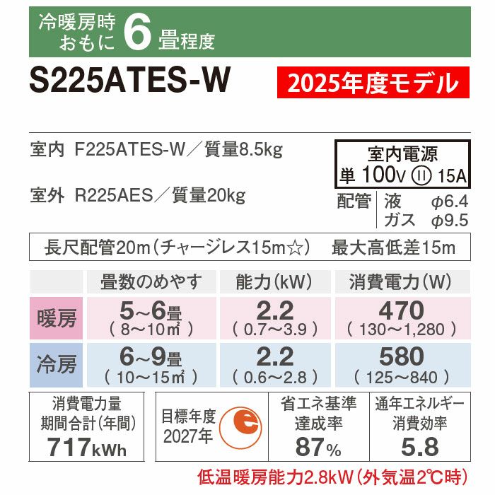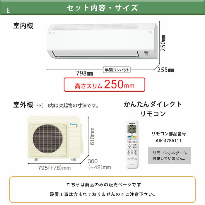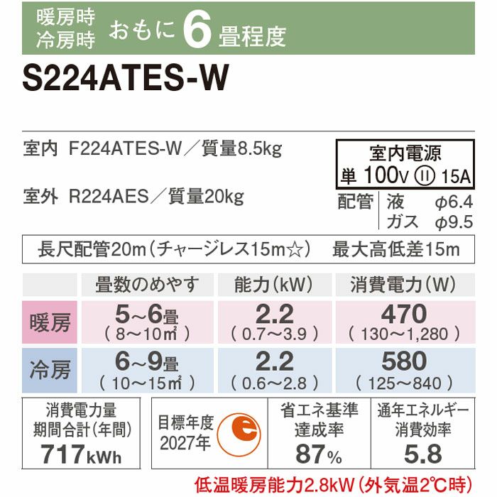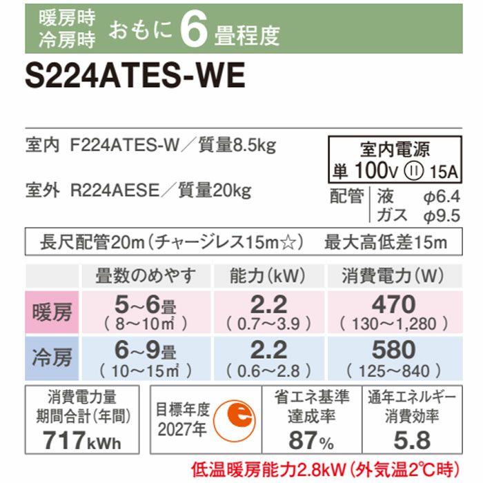 他の画像を見る ダイキン工業 S224ATES-W●エリア限定●標準工事費用込みエアコン。工事保証3年付。 【標準工事費込み】S224ATES-W ダイキン ルームエアコン Eシリーズ 主に6畳用 ダイキン Eシリーズ 標準工事費込み 代引不可 単相100V 2024年モデル ¥ 78,990 税込 詳細を見る お気に入りに登録する