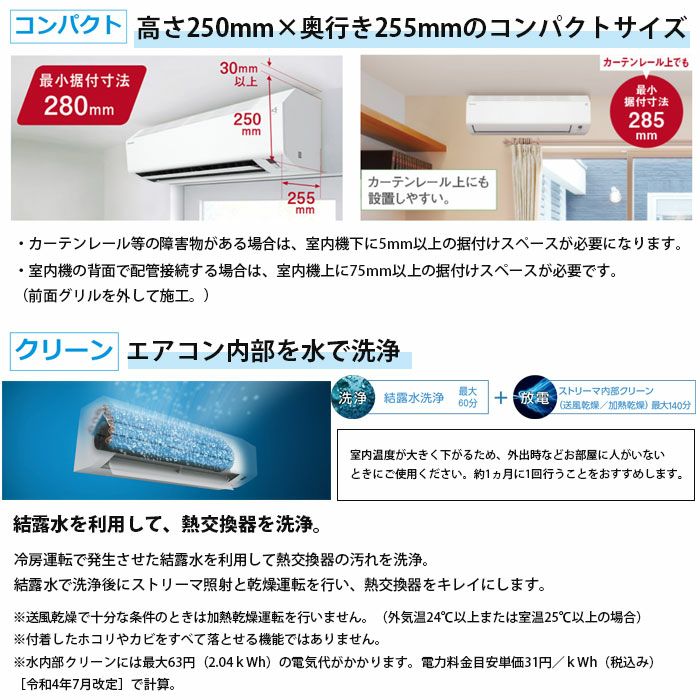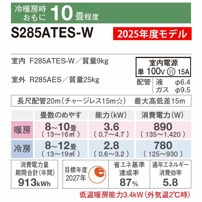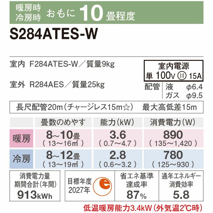 他の画像を見る 水内部クリーン機能を備えたコンパクトなベーシックモデル。主に10畳用。 S284ATES-W ダイキン ルームエアコン Eシリーズ 主に10畳用 ダイキン Eシリーズ 代引不可 単相100V 2024年モデル ¥ 79,280 税込 詳細を見る お気に入りに登録する