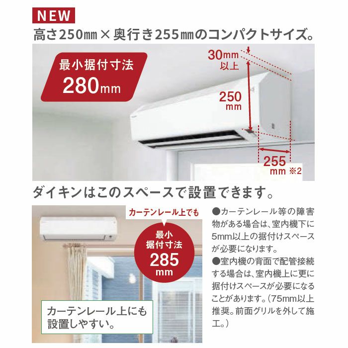 他の画像を見る 室内機の高さ250mm×奥行き255mmのコンパクトサイズ。主に14畳用。 S405ATEP-W ダイキン Eシリーズ エアコン 2025年モデル 主に14畳用 ダイキン Eシリーズ 代引不可 高さ250mm以下 単相200V 2025年モデル ¥ 98,990 税込 詳細を見る お気に入りに登録する