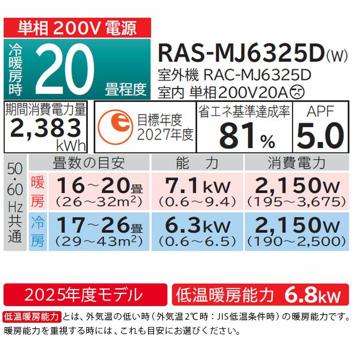 他の画像を見る 本体奥行き25㎝の薄型で寝室や子ども部屋などにもすっきり設置できる薄型モデル RAS-MJ6325D-W 日立 MJシリーズ 白くまくん ルームエアコン 2025年モデル 主に20畳用 日立 白くまくん 代引不可 単相200V フィルター自動洗浄 2025年モデル ¥ 133,100 税込 詳細を見る お気に入りに登録する